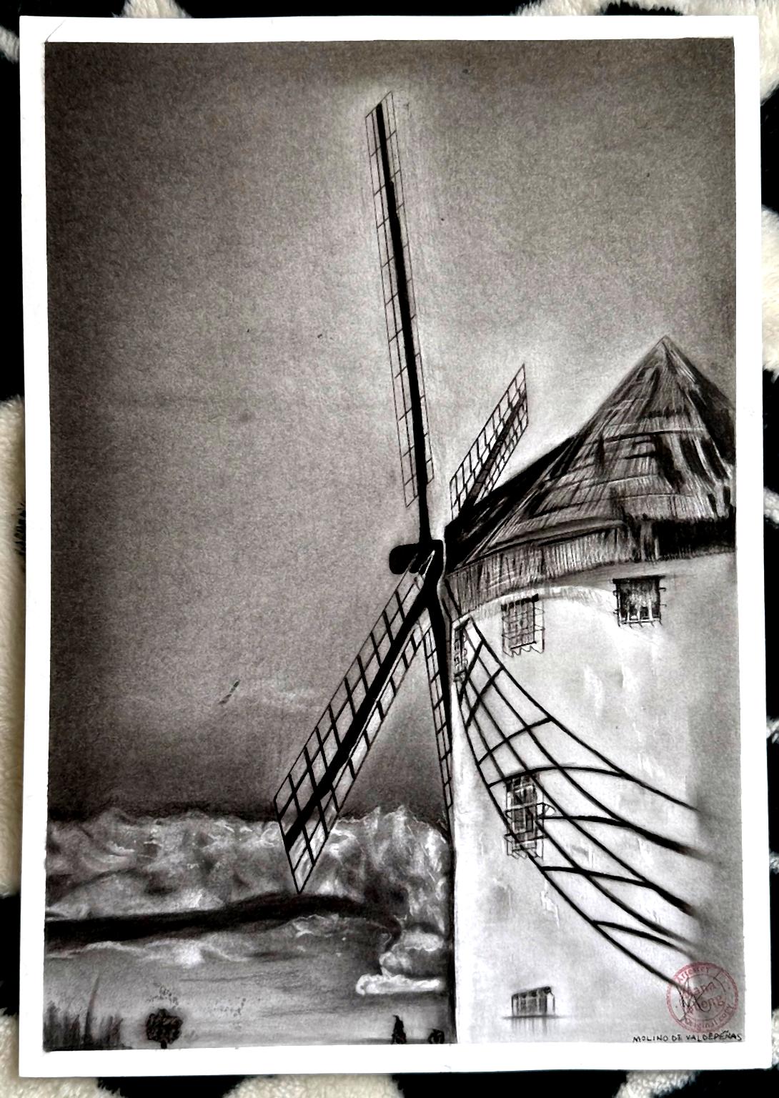 Para esta pieza, utilicé una combinación de grafito y carbón sobre papel, lo que me permitió jugar con los contrastes y lograr una profundidad visual notable. El cielo tiene un difuminado suave para crear un ambiente envolvente, mientras que las aspas del molino están delineadas con precisión para transmitir movimiento y perspectiva.